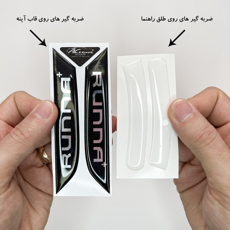 این محافظ ضربه گیر با الگو برداری دقیق فقط برای قاب آینه رانا پلاس توسط مجموعه آرسی زد اسپرت به صورت سه بعدی هایگلس طراحی و تولید شده، با استفاده از این ضربه گیر می توانیم ضمن جذاب کردن کردن نمای روبروی آینه های خودرو رانا پلاس، ظاهری اسپرت در آینه ها ایجاد کنیم. نصب این کالا بسیار آسان بوده، با استفاده از چسب بیرنگ پشت ضربه گیر ها فقط کافیست از روی کاغذ جدا کنید و با دقت روی قسمت مربوطه بچسبانید و تمام. همانطور که در تصاویر مشاهده می کنید این لیبل از متریال مرغوب کشور ایتالیا ساخته شده که به صورت ژله ایی می باشد. دارای چسب مخصوص تولید کشور کره که طی دراز مدت اثر چسب بجای نمیگذارد---ضد حرارت، پس نگران کنده شدنش در گرمای تابستان نباشید.---ضد خطو خش است، کدر نمی شود.---(دقت داشته باشید ک در سرما به هیچ عنوان نصب نکنید، با کمی حرارت دادن معادل حرارت بخاری خودرو به چسب لیبل می توانید به راحتی بچسبانید)